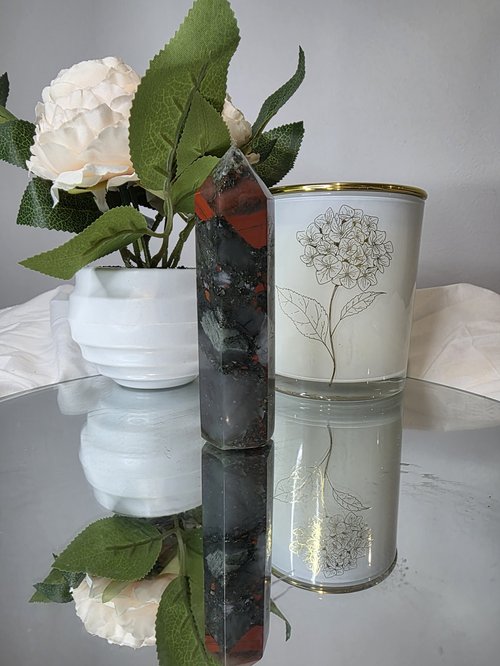 Channel bold, grounding energy with this striking African Bloodstone tower. Sourced from the rich lands of Africa, this unique variety of Bloodstone features deep forest greens, earthy browns, and occasional splashes of red—each piece a natural work of art.
