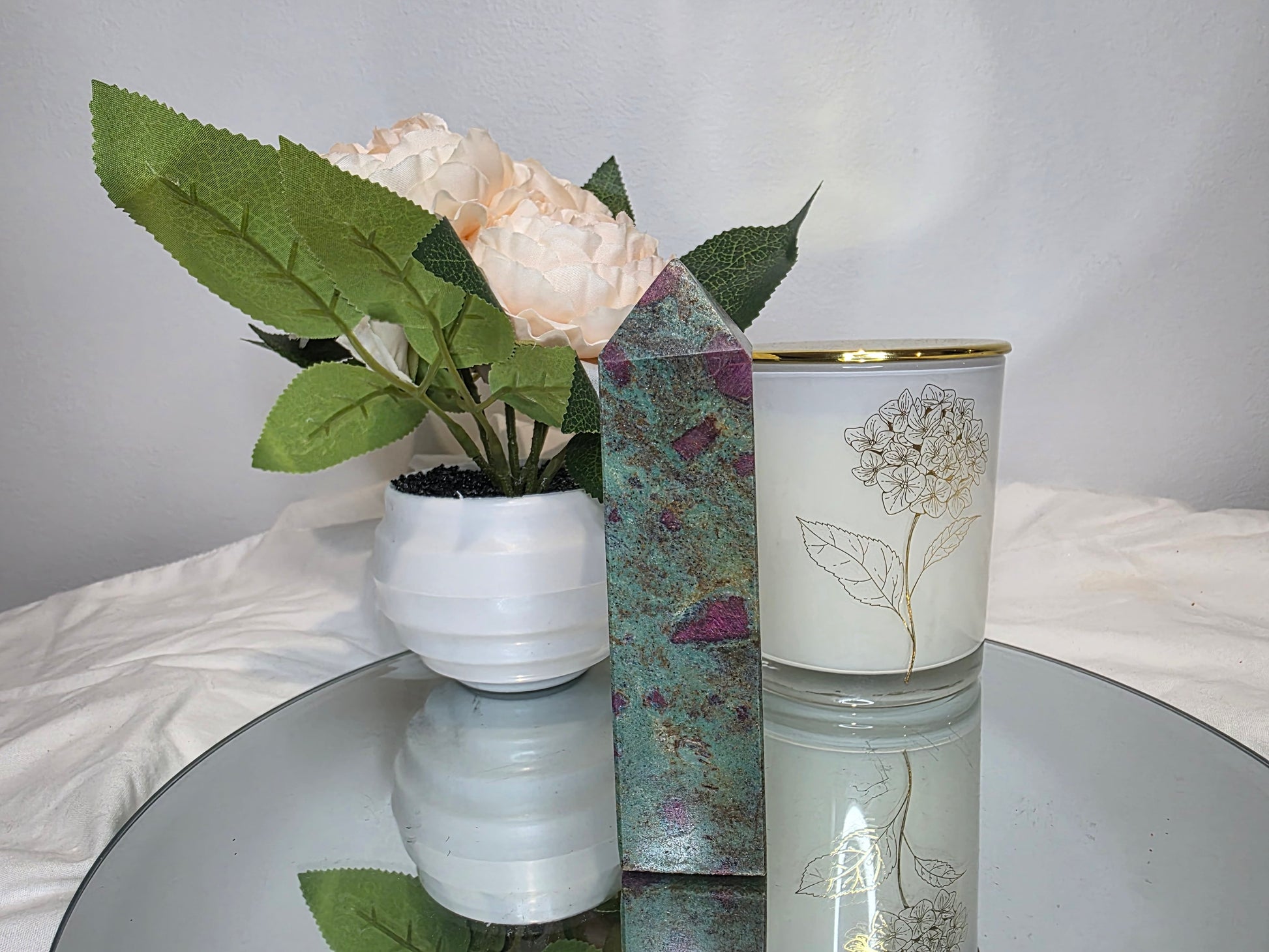 This striking 147g Ruby in Fuchsite tower combines the fiery passion of Ruby with the soothing, heart-based energy of Fuchsite. Rich green tones are beautifully accented by deep red Ruby inclusions, creating a stone that both energizes and nurtures. This unique combination supports emotional healing, self-worth, and heart chakra activation.