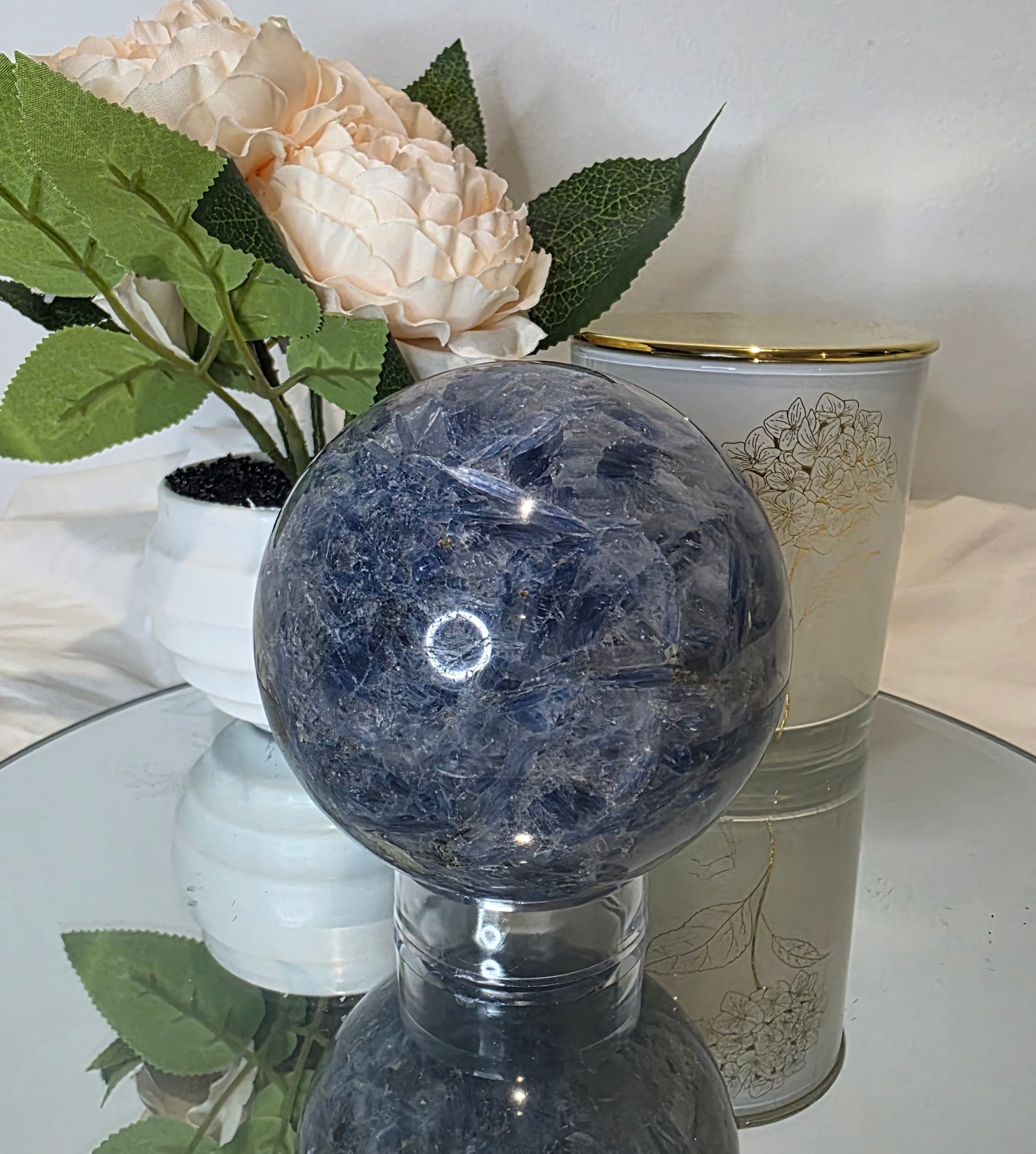 This striking 960g Blue Kyanite sphere shimmers with silvery blue striations, radiating a strong yet calming energy. Blue Kyanite is known for its unique ability to align all chakras without the need for cleansing. It enhances intuition, clear communication, and spiritual connection—making it a favorite among energy healers and intuitive practitioners.