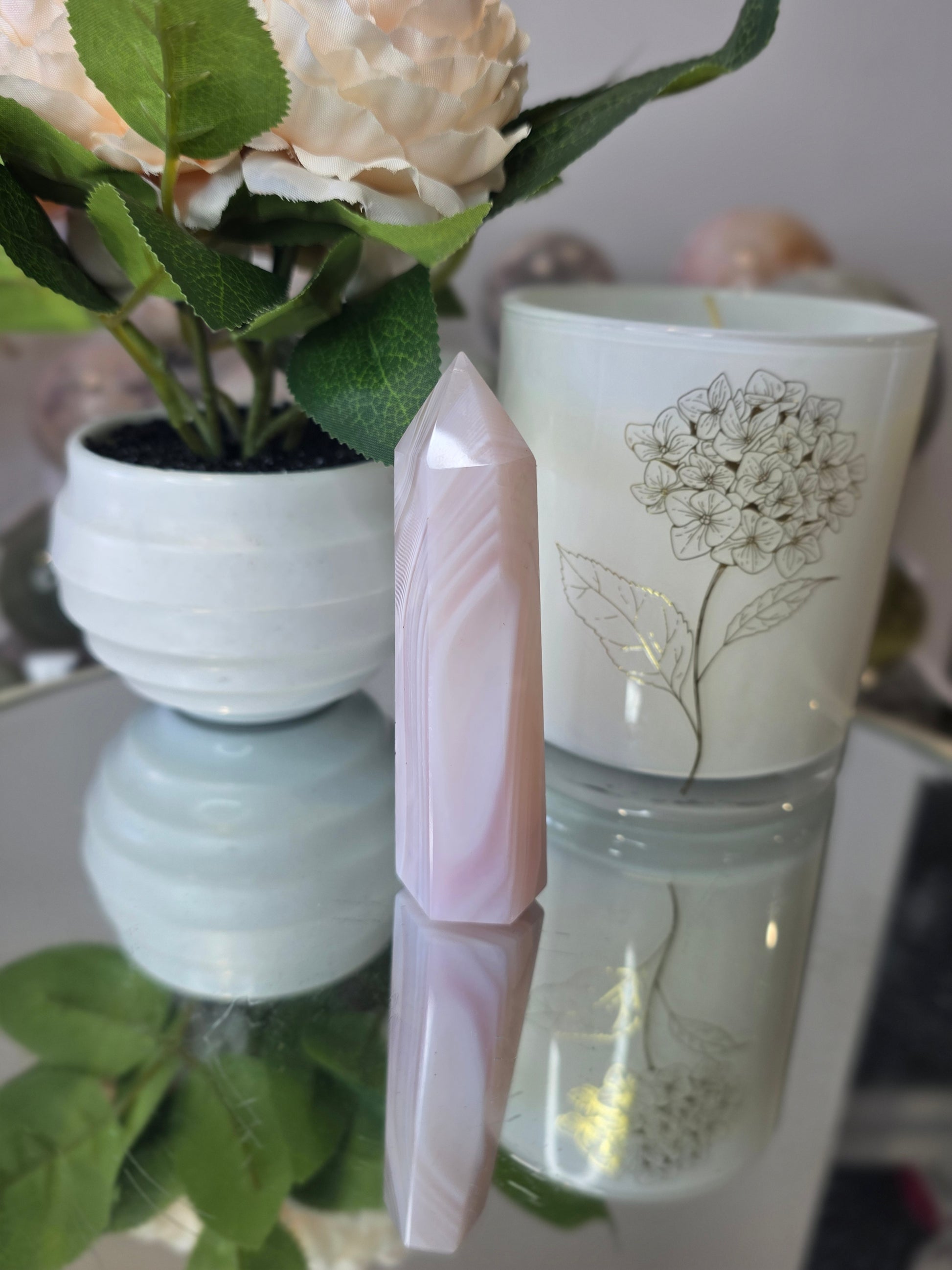 Soft and translucent with gentle pink hues, this Pink Jelly Agate tower radiates calm, compassion, and soothing energy — perfect for nurturing the heart and mind 💖🌿