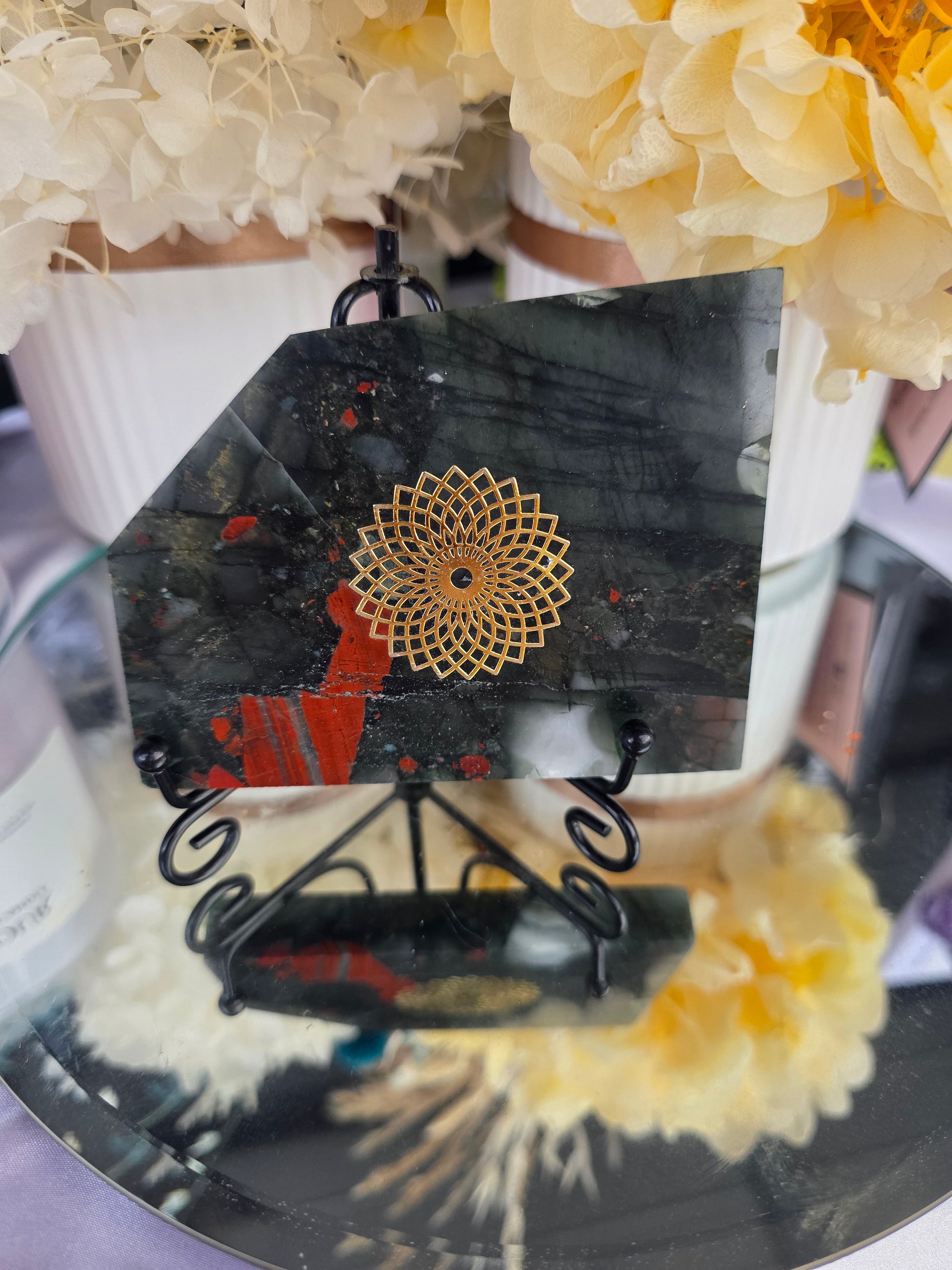 This striking African bloodstone slab showcases deep green hues flecked with vibrant red, creating a powerful and grounding energy. Traditionally known for courage, strength, and vitality, bloodstone supports emotional balance and boosts confidence.