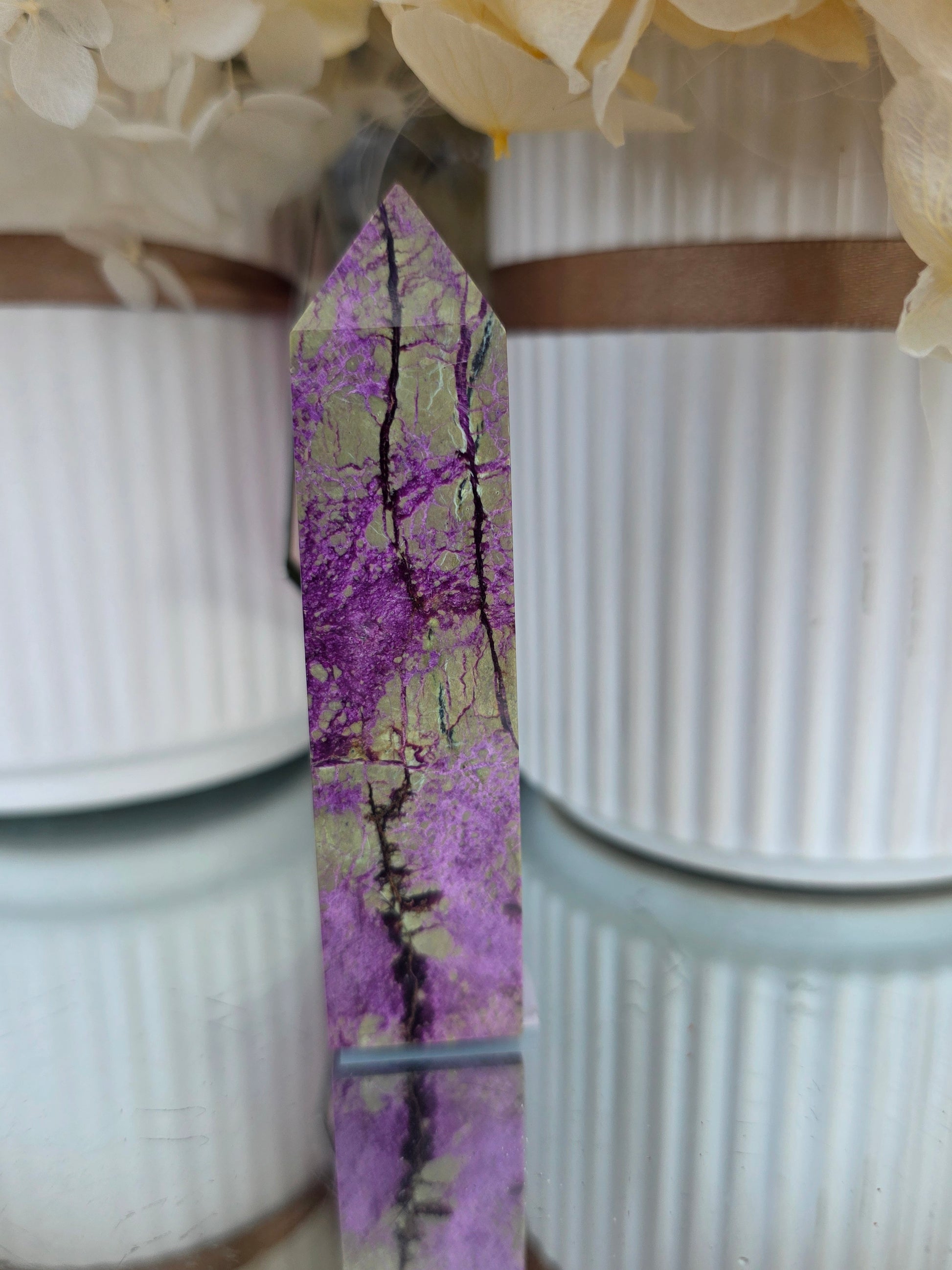 This striking atlantisite tower features swirling greens of epidote and soft purples of stichtite. Known for promoting emotional healing, balance, and spiritual growth, it encourages compassion, positivity, and intuitive awareness.